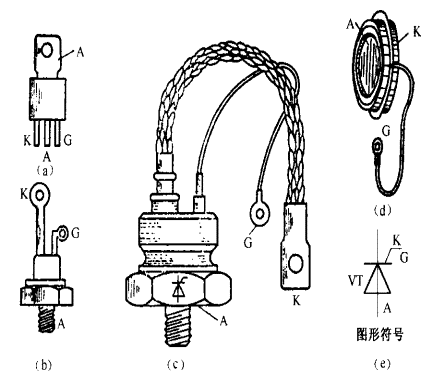 晶闸管是一种四层功率半导体器件,有三个引出极,阳极A、阴极K和门极G。常用的有螺旋式和平板式,外形与符号如图9.1所示。