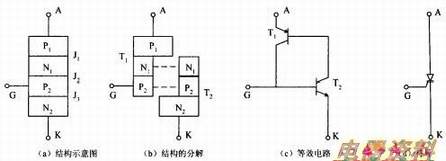 图9.3 晶闸管的结构、等效电路和符号