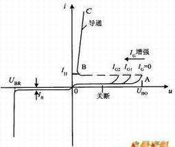 )时,晶闸管突然导通,进入伏PV安特性的BC段。此时晶闸管可通过较大电流,而管压降很小,这种导通方法极易造成晶闸管而损坏,应尽量避免。若在控制极与阴极间加上触发电压,则会降低转折电压。控制极IG越大,转折电压就越低(IG2>IG1>0)。导通后,若电流降低到小于维持电流IH时,晶闸管将由导通变为关断。