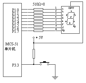 例7.1采用共阳极数码管与单片机P1口直接连接,其电路连接如图7.9所示,数码管公共阳极接+5V电源,其它管脚分别接P1口的8个端口,限流为510W,数码管字段导通电流约为6mA(额定字段导通电流一般为5 ~ 20 mA)。