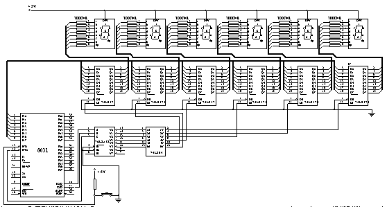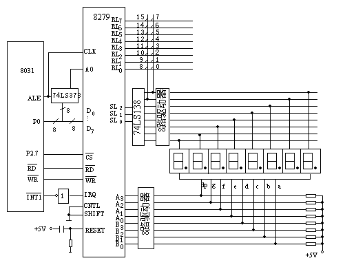 如采用图7.20的电路实现实训7中的功能,软件设计将有所改观。采用8279与8051接口,在CPU对8279进行初始化后,只需向8279传输待显示数据(送数),再就是在8279键盘中断申请发出后,取键盘数据识别按键(取数),即可实现按键识别和动态显示。至于要花费CPU大量时间的键盘扫描程序和动态显示程序,全由8279硬件自动完成,CPU再也不必象实训7那样不断调用动态显示子程序,不断查询是否有按键按下,大大提高了CPU的工作效率。读者可自行编程实现实训7中的所有功能。