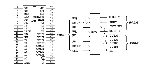 利用键盘、显示专用芯片8279能够以较简单的硬件电路和较少的软件开销实现单片机与键盘、LED显示器的接口。图7.20便是8279的一种具体应用。