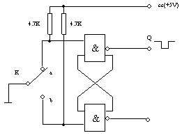 电路工作过程如下:按键未按下时,a = 0,b = 1,输出Q = 1,按键按下时,因按键的机械弹性作用的影响,使按键产生抖动,当开关没有稳定到达b端时,因2输出为0反馈到与1的输入端,封锁了与非门1,双稳态电路的状态不会改变,输出保持为1,输出Q不会产生抖动的波形。当开关稳定到达b端时,因a = 1,b = 0,使Q = 0,双稳态电路状态发生翻转。当释放按键时,在开关未稳定到达a端时,因Q = 0,封锁了与非门2,双稳态电路的状态不变,输出Q保持不变,消除了后沿的抖动波形。当开关稳定到达b端时,因a = 0,b = 0,使Q = 1,双稳态电路状态发生翻转,输出Q重新返回原状态。由此 右