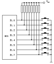 图7.4中按键输入均采用低电平有效,此外,保证了按键断开时,I/O口线有确定的高电平。当I/O口线内部有上拉时,外电路可不接上拉。