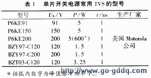 瞬态电压抑制器在承受瞬态高电压(例如浪涌电压、雷电干扰、尖峰电压)时,能迅速反向,由高阻态变成低阻态,并把干扰脉冲钳位于规定值,从而保证电子设备或元器件不受损坏。钳位时间定义为从零伏达到反向击穿电压最小值所需要的时间。TVS的钳位时间极短,仅1ns,所能承受的瞬态脉冲峰值电流却高达几十至几百A。其性能要优于器(VSR),且参数的一致性好。 TVS器件分为单向瞬态电压抑制器、双向瞬态电压抑制器两种类型。国内外产品有TVP、SE、5KP、P6KE、BZY、BZT等系列。单片开关中常用的TVS产品型号见表1。需要说明几点: