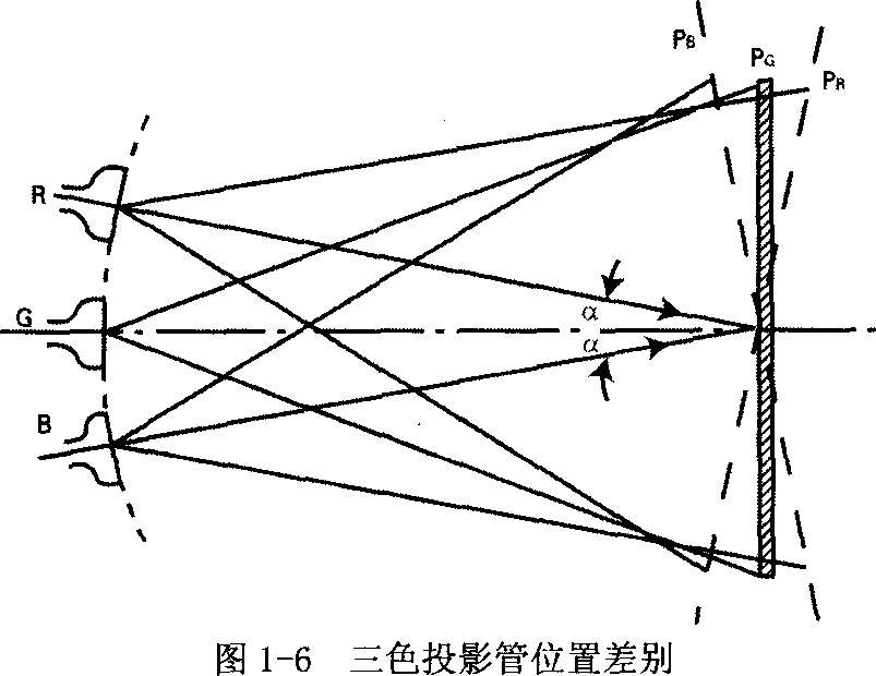 因为背投彩电的成像,是靠三束基色光束经过若干光学处理后,投射到显示银屏上实现的。由于三支投影管的机械安装位置不可能重叠,因此三支 光束传播的路径和聚焦面将不尽相同,如图1-6所示。若G管位于中间,其主光束线与银屏PG垂直,那么R管、B管的主光束线势必与G管成夹角α的方向射入,就不可能与现有银屏PG垂直。与它们垂直的屏幕分别是PR或PB,,因此在PG显示屏上不可避免地将产生三色会聚的偏差。另一方面,即使是位于中间的G管,由于平面形银屏的曲率半径(∞)与光束的曲率半径相差甚远,光束扫描到边缘的延伸效应,G光栅也会产生枕形失真,如图1-7所示。