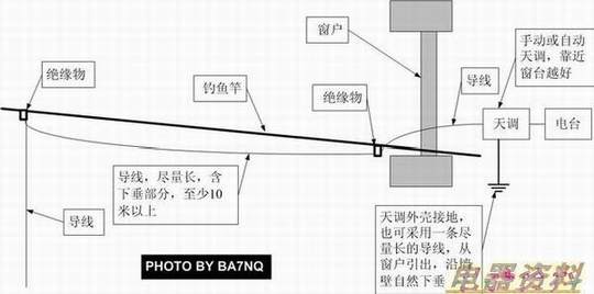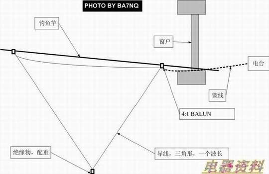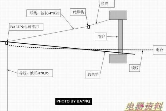 偶极天线有两个臂,一臂从窗口顶部拉到钓鱼竿的末端,另一臂丛钓鱼竿的末端自然下垂。两臂引到BALUN后,通过馈线接到收发机上,BALUN也可不用。