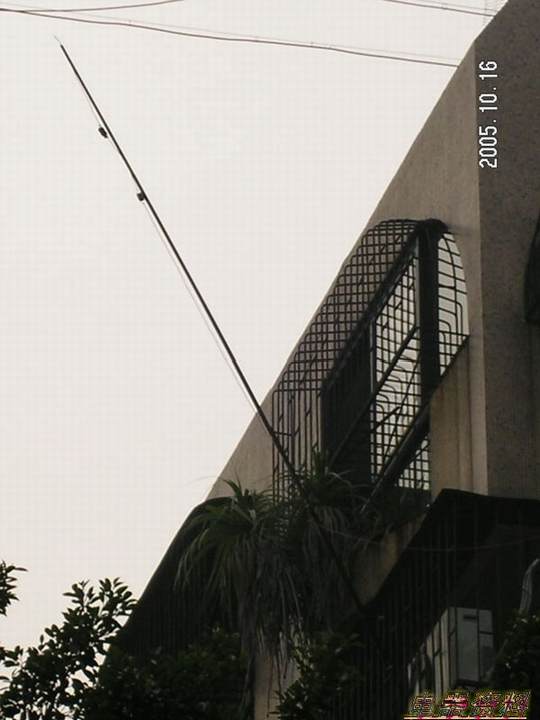 我住在小区的四楼,架楼顶天线是不可能的,我试过用十一米长的鱼竿天线,不论我用尽所有网上或书本上所有的资料去改做调试,效率都是非常低的(可能本人水平低吧),最近买一套单波段车载阳台两用的 BD6LM短波天线,效率及其它方面都好过鱼竿天线很多。。。。。。。 欧洲,台湾,江苏,泰国,日本,湖南等都接收到不少电台,现在我都不想再搞鱼竿天线了,搞鱼竿天线麻烦,又效率低。。。。。。 这是我在家里阳台上装的BD6LM阳台车载两用天线。