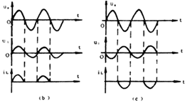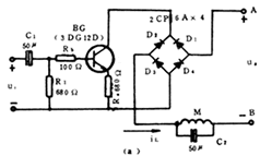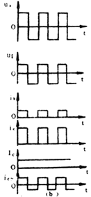 | 2、、全波相敏放大器 下图为全波相敏放大电,图中M为直流电动机的定子绕组,由解调得到的直流信号驱使电机转动,以执行终端显示任务。工作原理下:若Ui和Ua同相,当Ui和Ua为正半波时,BG导通,电流iL由A→D1→BG→Re→D3→M→B通过,iL→为正半波,设电动机M正转;反之,当Ui和Ua负半波时,BG反偏截止,所以iL为零(见下图b) |