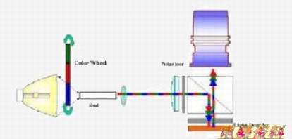 单片式Color Wheel光学引擎则是以快速旋转的ColorSwitch将白光形成循序的红、蓝、绿光,并将三原色光与驱动程式产生的红、蓝、绿画面,同步形成分色影像,再藉由人眼视觉暂留的特性,最后在人脑产生彩色的投影画面。类似的技术有:Displaytech发表的Fi Sequential Color、Philip所采用的Scrolling Color-Rotating Prism架构、及JVC采用的Spatial Color –Hologram架构。