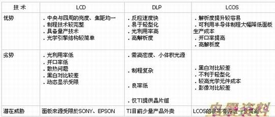 以LCOS的技术优势来看,在量产技术克服后,投影技术将呈现LCD、DLP、及LCOS三足鼎立之势。不过就目前三大技术的开发进度来看,LCOS仍是处于研发阶段,要有大幅的成长,目前看来仍嫌太早。就以近期的展览会中推出的投影机产品来看,仍然是以DLP强调超可携(Ultra-Portable)为重点,LCOS产品仍属少数。就联电所组成的LCOS联盟来看,在产品开发进度不如预期的情况下,联盟的声势不如当初,友达在去年底即已退出LCOS联盟,整机制造的厂商也不若当时的积极。加上DLP以其轻薄短小的特性,近期在商用可携式投影机市场崛起,成为投影机产业的耀眼的明星级产品,今年台湾许多投影机业者也相继投入DLP投影机阵营行列,这使得LCOS的声势相较不如DLP抢眼。