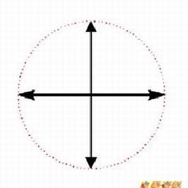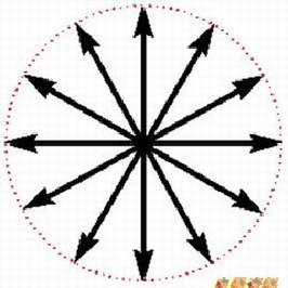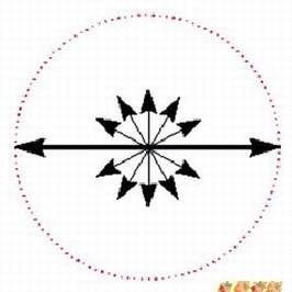 4.二十世纪初,爱因斯坦发现光的能量要用粒子学说才能解释,因而衍生出量子学。换言之,光同时具有波动及粒子两种特性。因为偏极光的理论是用波动学来解释的,所以往后的讨论都将光视为电磁波,并且为了简化易懂,我们只考虑其电场向量E。非偏极光的E可以用图2表示,图2中许多对称等长的辐射线表示E在E、H所组成的平面上振动,并且在各方向振动的机会均等。当E的分布不均时就称之为偏极化(Polarization),如图3所示为部份偏极光,当E只在一个方向振动时则称之为线性偏极光(图4)。从向量的观点来看,当图2中各方向的向量投影到X和Y两个相互垂直的坐标轴上后,非偏极光可以分解为两条相垂直的线性偏极光(图5)。