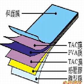 高分子膜在经过延伸之后,通常机械性质会降低,变得易碎裂。所以在偏光基体(PVA)延伸完后,要在两侧贴上三醋酸纤维(TAC)所组成的透明基板,一方面可做保护,一方面则可防止膜的回缩。此外,在基板外层可再加一层离型膜及保护膜,以方便与液晶槽贴合(如图十三)。