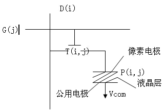 对于显示屏来说,每个从结构上可以看作为像素电极和共同电极之间夹一层液晶。更重要的是从电的角度可以把它看作。其等效为图1所示。要对j行i列的像素P(i,j)充电,就要把开关T(i,j)导通,对信号线D(i)施加目标电压。当像素电极被充分充电后,即使开关断开,中的电荷也得到保存,电极间的液晶分子继续有电场作用。数据(列)驱动器的作用是对信号线施加目标电压,而栅极(行)驱动器的作用是起开关的导通和断开。由于加在液晶层上的电压可存储使液晶层能稳定地工作。这个显示电压通过TFT也可在短时间内重新写入,因此,即使对高清晰度LCD,也能满足图像品质要求。