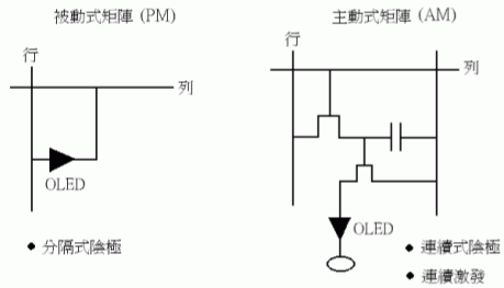一般来说,显示器 依驱动方式分为被动式(passive matrix,即PM-)与主动式(active matrix,即AM-O)两类,其设计原理如图一所示。被动式适合用在小尺寸的面版,因为其瞬间亮度与阴极扫瞄列数成正比,所以需要在高脉冲下操作,会使的寿命缩短。且因为扫瞄的关系也使其分辨率受限制,但成本低廉、制程简单是其一大优点。主动式恰与被动式特性相反,虽然成本较昂贵、制程较复杂(仍比TFT-容易),但每一个像素皆可连续与独立驱动,并可记忆驱动信号,不需在高脉冲电流下操作,效率较高,寿命也可延长,适用于大尺寸、高分辨率之高信息容量的全彩化OLED显示产品。