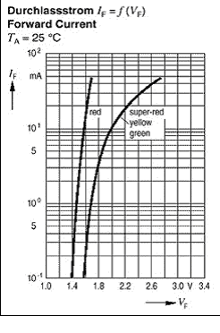 对于5mm直径的标准LED,图1给出了其正向导通电压(VF)与正向(IF)的函数曲线。[1] 注意LED的正向压降随着正向电流的增大而增加。假定工作于10mA正向电流的绿光LED应该有5V 的恒定工作电压,那么串接RV 等于(5V -VF,10mA)/10mA = 300 。如数据表中所给出的典型工作条件下的曲线图(图2)所示,其正向导通电压为2V。
