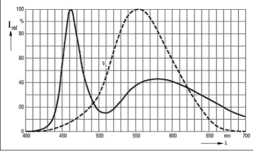 图4. 白光LED 的发射波长(实线)包括蓝光和黄光区域的峰值,但是在肉眼看来就是白色。肉眼的相对光敏感性(虚线)如图所示。