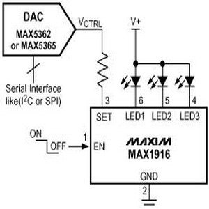使色彩坐标不发生移动的调光方案叫做脉宽调制。它能够由绝大多数可以提供使能或者关断控制的电源器件实现。例如,通过拉低EN电平禁止器件工作时,MAX1916可以将流经LED的泄漏电流限定在1μA,使发射光为零。拉高EN电平可以管理可控的LED正向电流。如果给EN引脚加脉宽调制信号,那么亮度就与该信号的占空比成正比。