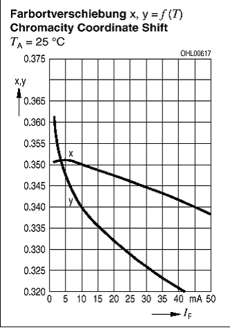 图5. 正向电流的变化改变了白光LED (OSRAM Opto Sconductors 的LE Q983)的色彩坐标,并因此改变了白光质量。
