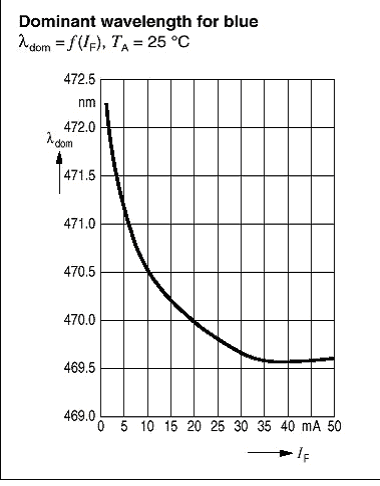 图6. 增加的正向电流通过改变其发射波长而改变了蓝光LED 的色彩。