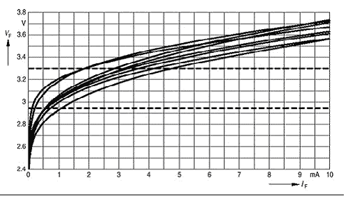 图7. 曲线显示了不同白光LED 的电流-电压特性之间的相当大的差异,甚至是从同一产品批次中随机挑选的LED。因此,用恒定的3.3V驱动这样几个并联的LED会导致不同亮度的白光(上虚线)。