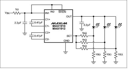 LED 供电电源的目标是提供一个足够高的输出电压,并且在并联连接的LED 上加载同样的电流。注意(如图5 所示),如果并联配置的所有LED 具有一致的电流,那么所有的LED 将会具有相同的色彩坐标。Maxim 提供带有电流控制的电荷泵,以实现这一目标(MAX1912)。图8所示的三个并联的LED,电荷泵具有较大量程,可以提高输入电压至1.5倍。早期的电荷泵只能简单的使输入电压倍压,而新的技术则提供了更好的效率。将输入电压升高至恰好可以驱动LED 工作的。连接至SET(10 引脚)的电阻网络保证所有LED 的电流一致。内部保持SET 电平在200mV,这样就可以计算出流经每个LED 的电流ILED = 200mV/10 = 20mA。如果某些二极管需要较低的电流,可以同时并联驱动3个以上的LED,MAX1912的输出电流可达60mA。