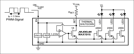 图9. 单个外部电阻(RSET)设定流经每个LED 的电流数值。在IC 的使能引脚(EN)上加载脉宽信号可以实现简单的亮度控制(调光功能)。