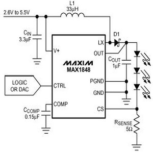 除了前面所提到的电荷泵(MAX1912)之外,还可以实现带有电流控制的升压转换器。比如,开关模式电压转换器MAX1848,可以产生最高至13V 的输出电压,足以驱动三个串联的LED (如图11 所示)。这种方法也许是最简洁的,因为所有串接的LED 具有完全相同的电流。LED 电流由RSENSE 与加载在L 输入上的电压共同决定。