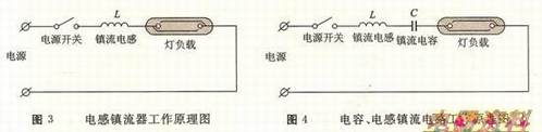 镇流是一种得到广泛应用的镇流方法,但它的损耗比电容镇流要大,但是灯电流在50交流供电频率下的较电容镇流要小得多,使用时需配用启动器。电感镇流器工作原理如图3所示。
