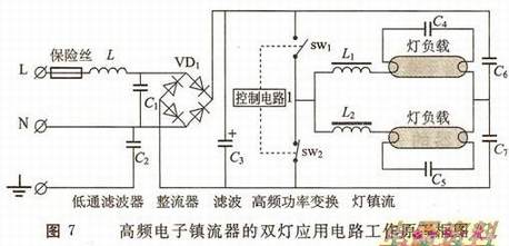 ① 单灯、双灯或4灯应用的电子镇流器。电子镇流器的双灯应用电路工作原理框如图7所示。