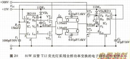 桥功率变换电路中需要4只功率晶体管,对灯工作电压较高和功率较大的一些电子镇流器电路,采用全桥功率变换电路比较合适。图20是一种80W双管T12荧光灯采用全桥功率变换电子镇流器的电路原理图。