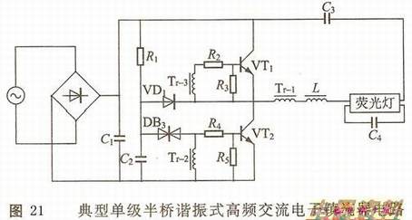 ① 单级半桥谐振式高频交流电子镇流器。由于半桥谐振式逆变电路具有自平衡能力强、工作可靠,对开关管耐压要求较低等一系列优点,所以采用半桥谐振式逆变电路为灯负载供电的功率变换电路得到广泛应用。它主要由:交流市电供电整流、电路;启动电路;串联谐振高频逆变电路;保护电路;灯负载等几部分电路组成。典型单级半桥谐振式高频交流电子镇流器电路原理如图21所示。