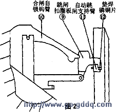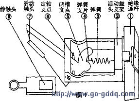 当合上开关胶木柄时,绝缘连杆①带动触头支架②转动(见图1、图2所示),使动触头⑦产生与静触头⑧闭合的趋势。在此运动过程中,活动触头支架②内的弹簧③压缩;同时,由于角度变化关系,弹簧支片④与动触头弧形凹槽支点⑤及动触头定轴支点⑥,三点超过成直线的死角(180度)时弹簧⑨伸长,给凹槽支点⑤一定的推力,使动触头⑦与静触头⑧闭合。但是在使用中,由生锈、灰尘等原因,凹槽支点⑤的位移不够,使弹簧③不能通过死角,这样动触头没有转动力距而不能闭合,造成缺相。若新开关凹槽支点⑤处不光滑有毛刺,也会发生新开关缺相闭合的故障。