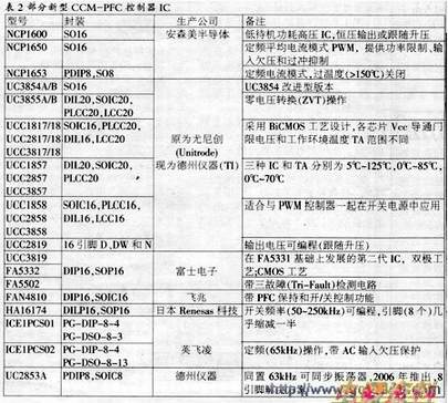 CCM-PFC电路适用于中大功率开关电源和变频调速器及高亮度放电(IliD)灯电子驱动器。在500W以上的开关电源应用中,PFC/PWM组合IC(如UCC38500系列、CM6900系列和MIA800系列等)因适用功率范围较小。是难以取代CCM-PFC独立单片IC的。表2列出了部分新型CCM-PFC控制IC.