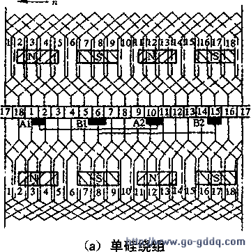 硅绕组是由接在同一换向器并联运行的叠绕组和波绕组组合而成的一种混合绕组,因其外形如硅而得名。单叠绕组和复波绕组组成的混合绕组叫单硅绕组,双叠绕组和复波绕组组成的混合绕组叫复硅绕组,其绕组的展开图如图所示。