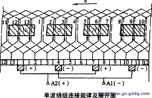 单波绕组的连接规律是l号线圈的两个边分别放在1号槽的上层和4号槽的下层,1号槽与4号槽相距约一个极距,1号线圈的首尾端分别接在相距约两个极距的1号换向片和7号换向片上;接着2号线圈的两个边分别放在7号槽的上层和10号槽的下层,首尾端分别接到7号换向片和13号换向片上。l号和2号两个线圈串联,正好绕电枢一周。接着绕下去,最后形成一个闭合回路。