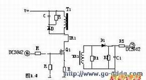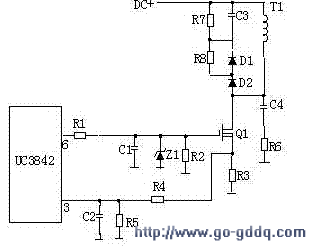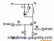 R4、C3、R5、R6、C4、D1、D2组成,和开关MOS管并接,使开关管电压应力减少,EMI减少,不发生二次。在开关管Q1关断时,的原边线圈易产生尖峰电压和尖峰电流,这些元件组合一起,能很好地吸收尖峰电压和电流。从R3测得的电流峰值信号参与当前工作周波的占空比控制,因此是当前工作周波的电流限制。当R5上的电压达到1V时,UC3842停止工作,开关管Q1立即关断 。 R1和Q1中的结CGS、CGD一起组成RC网络,电容的充放电直接影响着开关管的开关速度。R1过小,易引起振荡,电磁干扰也会很大;R1过大,会降低开关管的开关速度。Z1通常将MOS管的GS电压限制在18V以下,从而保护了MOS管。 Q1的栅极受控电压为锯形波,当其占空比越大时,Q1导通时间越长,变压器所储存的能量也就越多;当Q1截止时,变压器通过D1、D2、R5、R4、C3释放能量,同时也达到了磁场复位的目的,为变压器的下一次存储、传递能量做好了准备。根据输出电压和电流时刻调整着⑥脚锯形波占空比的大小,从而稳定了整机的输出电流和电压。 C4和R6为尖峰电压吸收回路。
