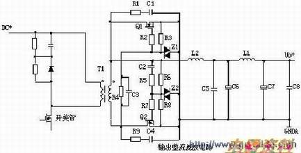 T1为开关变压器,其初极和次极的。D1为整流,D2为续流二极管,R1、C1、R2、C2为削尖峰电路。L1为续流,C4、L2、C5组成π型。