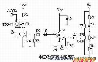 当输出 U0升高,经取样电阻R7、R8、R10、VR1分压后,U1③脚电压升高,当其超过U1②脚基准电压后 U1①脚输出高,使Q1导通,光耦OT1发光,光电三极管导通,UC3842①脚电位相应变低,从而改变U1⑥脚输出占空比减小,U0降低。 当输出 U0降低时,U1③脚电压降低,当其低过U1②脚基准电压后U1①脚输出低电平,Q1不导通,光耦OT1发光二极管不发光,光电三极管不导通,UC3842①脚电位升高,从而改变U1⑥脚输出占空比增大,U0降低。周而复始,从而使输出电压保持稳定。调节VR1可改变输出电压值。