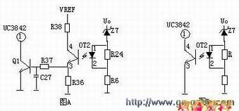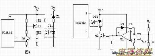 图A的工作原理是,当输出电压Uo升高,稳压管导通,光耦导通,Q2基极得电导通,由于Q2的导通Q1基极电压降低也导通,Vcc电压经R1、Q1、R2使Q2始终导通,UC3842③脚始终是高电平而停止工作。在图B中,UO升高U1③脚电压升高,①脚输出高电平,由于D1、R1的存在,U1①脚始终输出高电平Q1始终导通,UC3842①脚始终是低电平而停止工作。正反馈?