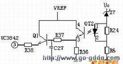 输出限压保护电路如下图,当输出电压升高,稳压管导通光耦导通,Q1基极有驱动电压而道通,UC3842③电压升高,输出降低,稳压管不导通,UC3842③电压降低,输出电压升高。周而复始,输出电压将稳定在一范围内(取决于稳压管的稳压值)。