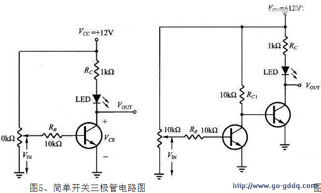 简单三极管开关:电路如图5,RC是限流用,以防止过高烧坏LED(),将输入信号 VIN 从0 调到最大 (等分为约20 个间隔),观察并记录对的 VOUT 以及LED 的亮度。当三极管开关为断路时,VOUT =VCC =12 V,LED 不亮。当三极管开关通路时,VOUT = 0.2V ,LED 会亮。改良三极管开关:因为三极管由截止区过度到饱和区需经过线性区,开关的效果不会有明确的界线。为使三极管开关的效果明确,可串接两三极管,电路如图六。同样将输入信号 VIN 从0 调到最大 (等分为约20 个间隔),观察并记录对应的VOUT 以及LED 的亮度。