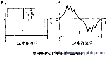 晶闸管逆变桥是由同一侧的晶闸管相互关断的,所以,输出的波是矩形波,如图(a)所示。而波形如图(b)所示。