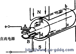 直流电动机是根据通体在磁场中受力的作用而产生运动这一原理而转动的。如图所示。由图示位置,当电刷A、B接上直流时,A刷为正极、B刷为负极,此时从A刷流入线圈,沿a→b→c→d方向流动,由B刷流出。按左手定则判断出线圈逆时针转动。当扎ab由N极下转到s极下、cd边由s极下转到N极下时,电流在线圈中流动的方向变为d→c→b→a,但线圈边受力方向仍使它逆时针旋转。外的电流永远是从A刷流入、由B刷流出,靠换向器的作用。保证任一磁极下导体中的电流方向不变,从而使线圈转动方向不变,于是电动机就起动了。