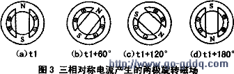 (1)旋转磁场的产生通常三相绕组在定子铁心的空间位置按120度电角度分布。当接入对称三相时,在某一瞬间(假定此时电流由Ul、V1、w1正向流入,用(×)表示)t1,两极电机绕组中将产生如图3(a)的磁场,在t1+60度 产生如图3(b)的磁场,同样在tl+120度、t1+180.时产生如图3(c)、图3(d)所示的磁场。可以看出电流由t1变化到t1+180.时,磁场方向也转动了180度电角度。可见电流完成一个的变化,合成磁场也必然在空间旋转一周,合成磁场在空间不断转动,就形成了旋转磁场。