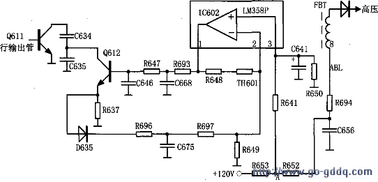 左图所示夏普29N42型彩电高压稳定电路属逆程容量控制型高压稳压电路。它主要由运算放大器I c 6 0 2(LM358P)和控制管Q612等组成。其原理是:当图像较亮时,电子束流较大一行输出变压器高压绕组下端(8脚)电压降低→经R694、R652后使。R653右端(图中A点)电压降低→运放IC602的3脚(同相输入端)电压降低→同相放大后l脚输出电压降低→控制管Q612 b极电位下降→导通减弱→等效增大→c634、C635串联构成的行逆程电容的总容量减小→行逆程脉冲幅度增大→对高压起到提升作用,使光栅幅度不至于扩大。当图像亮度变暗时,控制过程与上述相反,使等效行逆程电容容量增大→行逆程脉冲幅度减小→对高压起到降低作用,使光栅幅度不至于缩小。在左图中C646、R647、C668构成π型电路,以滤除IC602的l脚输出的交流成份,使控制管Q 6 1 2的导通程度能得到平稳控制,R648、TH601(负热敏电阻)以及R697、R696、D635等构成直流负反馈电路,以稳定运算放大器的放大倍数。