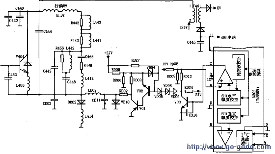 以松下(画王)TC-33V30H彩电(右图)为例介绍该高压稳压电路。由图可知:行输出管Q551集电极供电是由140v经R561、易磁饱和电抗器L1514次级、行输出变压器初级9、10绕组提供的。当图像画面为亮景时,显像管中的电子束流增大,阳极高压势必降低,反映在行输出变压器次级高压绕组末端的11脚的必降低,也就使加在运算放大器l50l(BAl5218N)3脚(输入端)的电压降低,经放大后其1脚的输出电压降低,也就使经R1531加至运算放大器Icl502(BAl5218N)3脚(同相输入端)的电压降低,经放大后1脚输出电压下降,即加在Icl502另一放大器6脚(输入端)电压降低,经放大后7脚输出电压上升,即经R1514加至Q1501 b极电压上升,Q1501导通增加,使流过电抗器L1514初级线圈的电流增大,于是L1514的量下降,次级绕组下降,导致流过次级绕组,也就是流过行输出变压器初级绕组的电流增大,以增加激励,以使高压升高,反之亦然。这样,由于高压趋于自动稳定,图像尺寸也趋于自动稳定。图中R1512是Q1501工作点调整,即L1514起控点高低的调整。另外Q1503、Q1504是用以稳定光栅尺寸的。当画面为亮景(即高压下降)时,由上述分析可知7脚输出电压是上升的,显然Q1503导通增加,c极电压下降,即Q1504 b极电压下降,Q1504导通减弱,其e极电压升高,使得经R1522送至枕形校正电路输出级管b极的升高,使输出管导通增大,导致流过行偏转线圈的电流减小,使光栅水平尺寸不至于扩大(这部分电路未画出,详细原理从略),反之亦然。