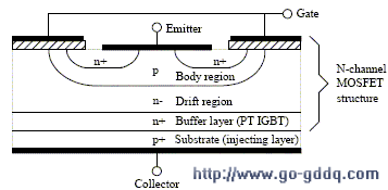 当然,世界上没有免费的午餐,较低的开态电压的代价是开关速度变慢,特别是在关闭时。 原因是,在关断时,电子流可以突然停止,就跟在功率MOSFET中一样,通过降低栅极和发射极之间的电压使其低于阈值电压。然而,空穴仍然留在漂移区,除了电压梯度和中和没有办法移除它们。IGBT在关闭期间的尾电流一直要持续到所有的空穴被中和或被调制。调制率是可以控制的,这是图1中N +缓冲层的作用。 这种缓冲层在关闭期间迅速吸收捕获的空穴。 并非所有的IGBT纳入一个n+缓冲层; 那些被称为穿通型(PT)的有,那些被称为非穿通型(NPT)的没有。 PT IGBTs 有时被称为不对称的,NPT是对称的。
