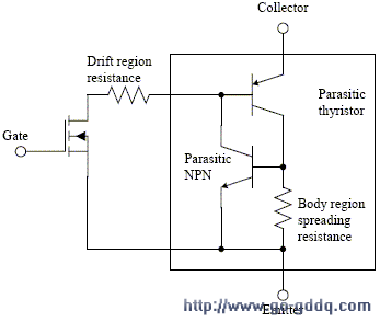 所有的N通道功率MOSFET都存在寄生NPN双极型晶体管,因此所有N3channel的IGBT也都存在。寄生NPN晶体管的基极是体区域,基极和发射极短接以防止晶体管开启。 但是请注意,体区域存在,既体扩散(body region spreading resistance),如图3所示。 P型衬底,漂移区和体区域组成了IGBT的PNP部分。该PNPN结构形成了寄生晶闸管。 如果寄生NPN晶体管开启并且NPN和PNP晶体管的增益和大于1,闭锁就发生了。 闭锁是通过优化IGBT的掺杂水平和设计不同区域的尺寸来避免的,如图1所示。