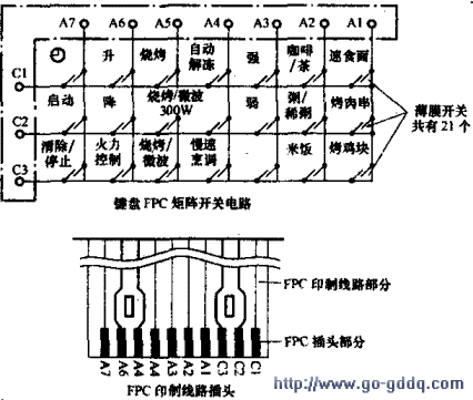 微电脑控制型微波炉的电脑板和控制面板中常常应用了薄膜开关和C(柔性或软性)印制板,如控制面板中的手感良好的平面轻触键盘开关和数字符号显示屏等。FPC也称软性连接元件,具有可任意弯曲折叠、盘绕半径小、既轻又薄、占用空间小等特点,在现代家电和仪表等设备已获广泛应用。